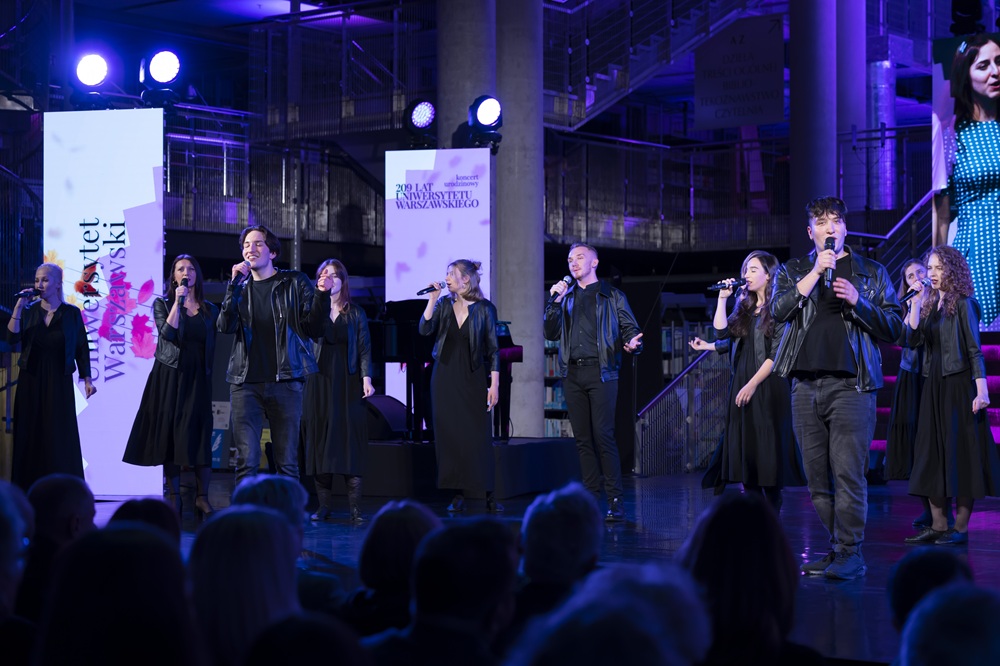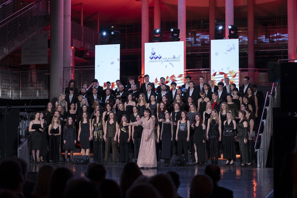 “Pamiętajcie o ogrodach” (Remember the Gardens), “Opoczyńskie malowanki” (Opoczno Paintings)  and “Samba una nota” were selected pieces performed during the event by the university ensembles – the Academic Choir, the Hybrydy Theatre, and the “Warszawianka” Dance Theatre. The concert celebrating the 209th anniversary of the University of Warsaw took place on 20th November at the University of Warsaw Library. The evening’s special guest was Katarzyna Pakosińska – a graduate of Polish studies at the University of Warsaw, a stage and theatre actress, journalist, and master of ceremonies, who presented her original satirical and musical program entitled “Three Decades of Laughter.”