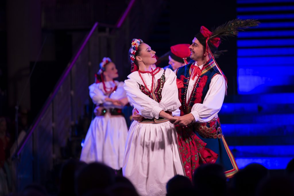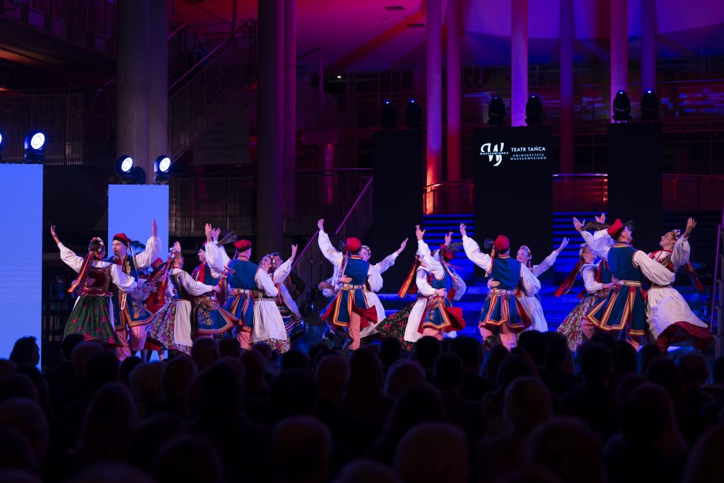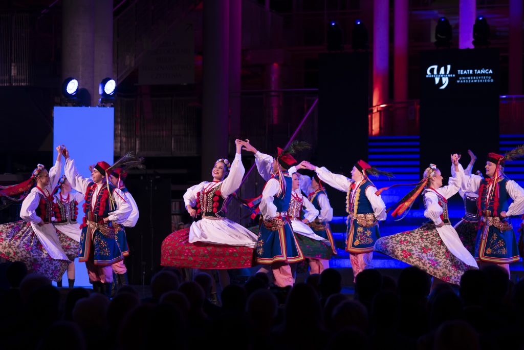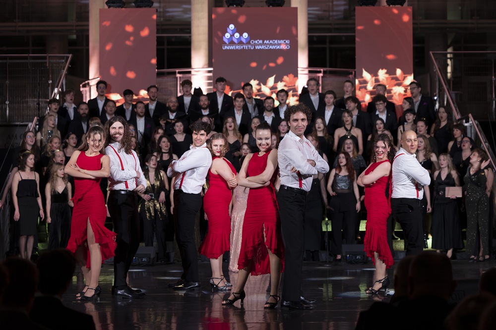 The University of Warsaw Dance Theatre “Warszawianka” presented dances inspired by folk motifs, “Opoczyńskie malowanki” (Opoczno Paintings) and “Krakowiak,” choreographed by Małgorzata and Jan Łosakiewicz, with music composed by Witold Jarosiński. The University of Warsaw Academic Choir, conducted by Dr Irina Bogdanovich, performed the songs “Absolutnie” (Absolutely), “Samba una nota,” “Salsco,” and “Podaruj mi trochę słońca” (Give Me Some Sunshine).